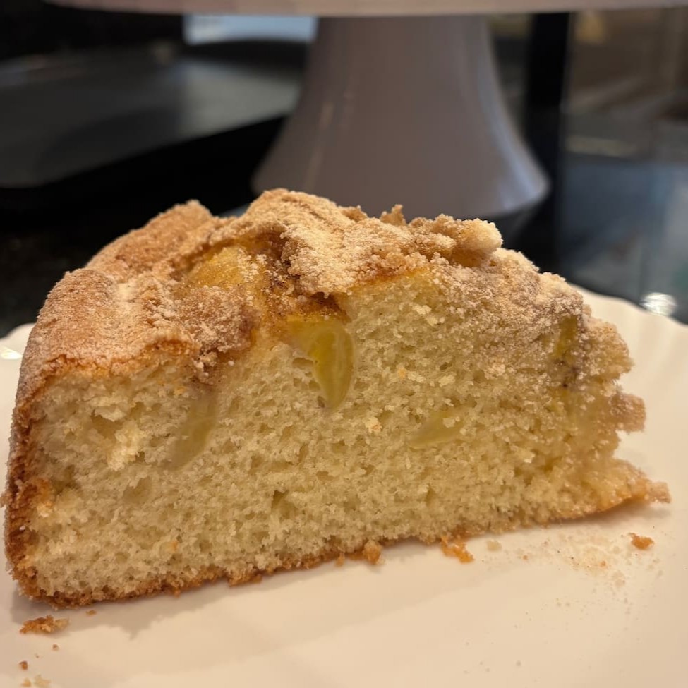 Uma fatia de Bolo de Banana. A massa do bolo fofinha, recheada com banana e coberta com açúcar e canela. Tamanho aproximado: 120g