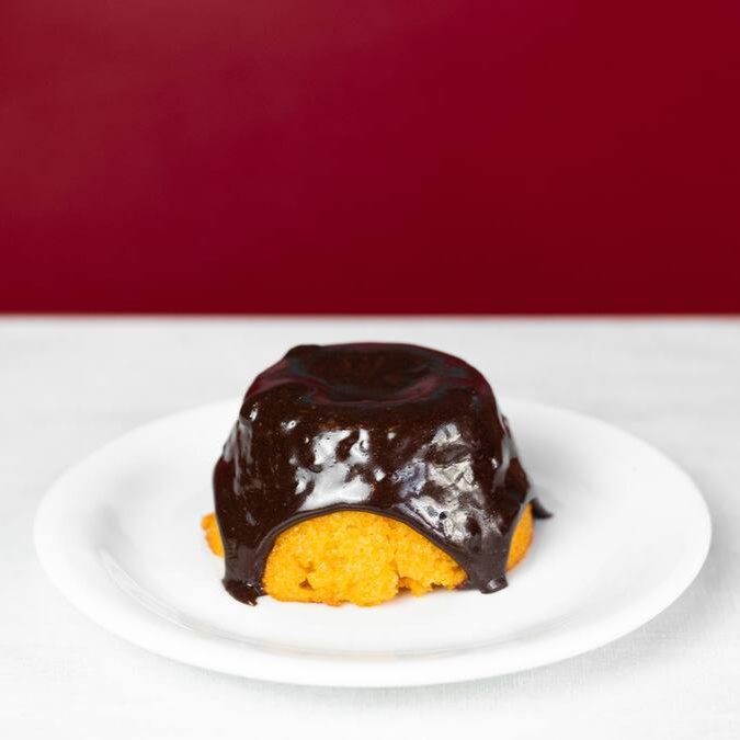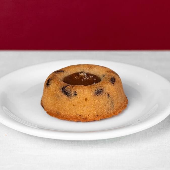 Receita francesa de bolinho de farinha de amêndoas com gotas de chocolate e calda de caramelo salgado.