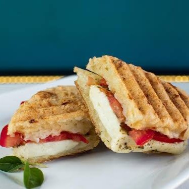Pão ciabata, mozzarela di bufala, tomate cereja e manjericão
