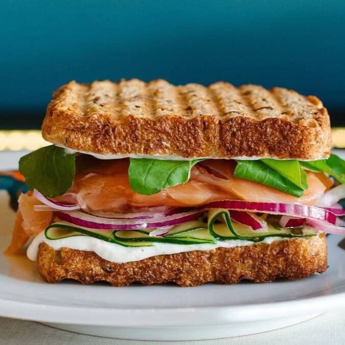 Delicioso sanduíche com 100g de salmão gravalax (marinado), tomate, pepino, rúcula, cebola roxa, creme de limão no pão de grãos.