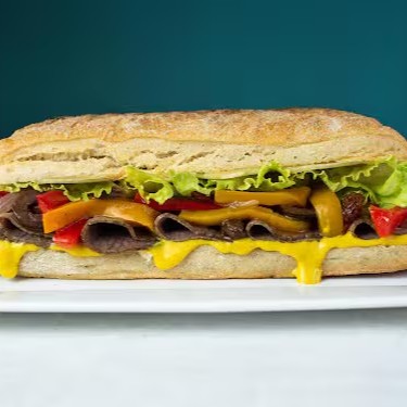 Pão ciabatta, rosbife, queijo gruyere, alface, peperonata e mostarda.