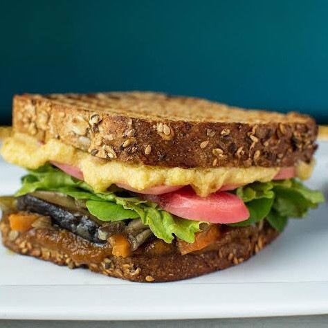 Sanduíche vegano feito no pão integral com hommus (pasta de grão de bico) picles de rabanete, caponata de cogumelos, alface, rúcula e barbecue de abacaxi.