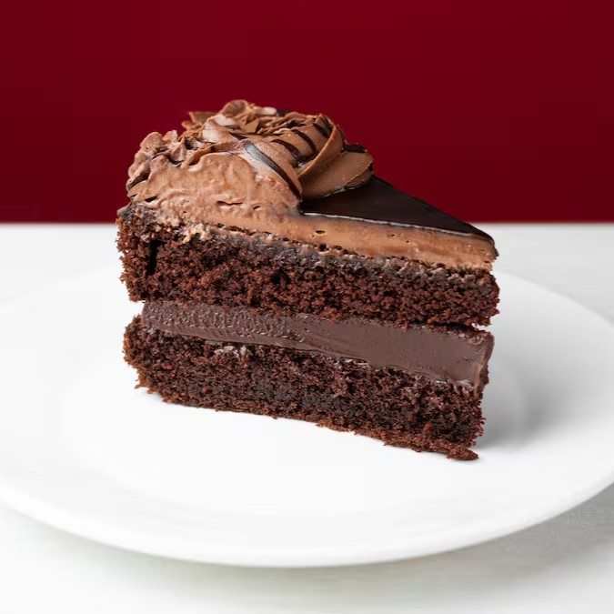 Fatia de bolo de chocolate com recheio de brigadeiro e cobertura de buttercream com chocolate.