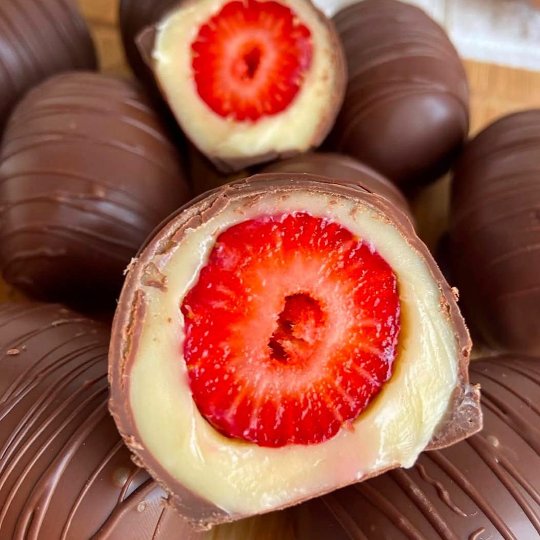Massa 50% cacau, recheio Leite Moça com pedaços de morangos frescos