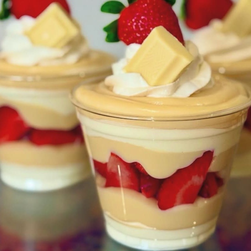 Brigadeiro de chocolate branco cremoso, calda de frutas vermelhas, morangos frescos, brownie e chocolate meio amargo. ( não modificamos ou retiramos itens )
