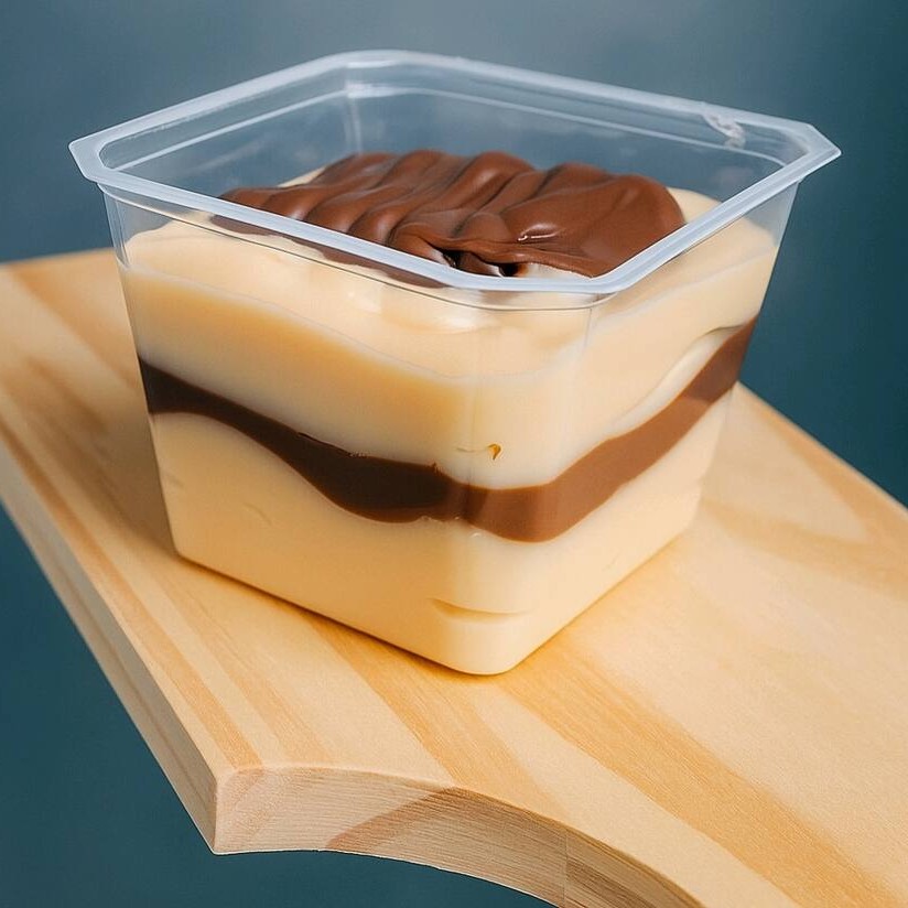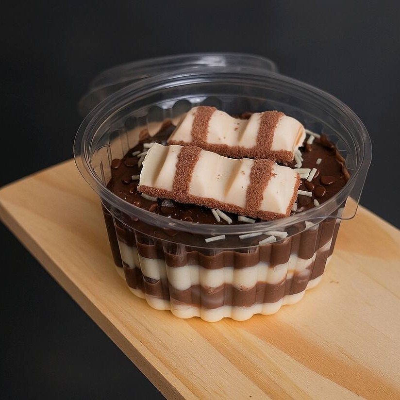 Bolacha maisena umedecida, creme branco , finalizado com ganache de chocolate blend .