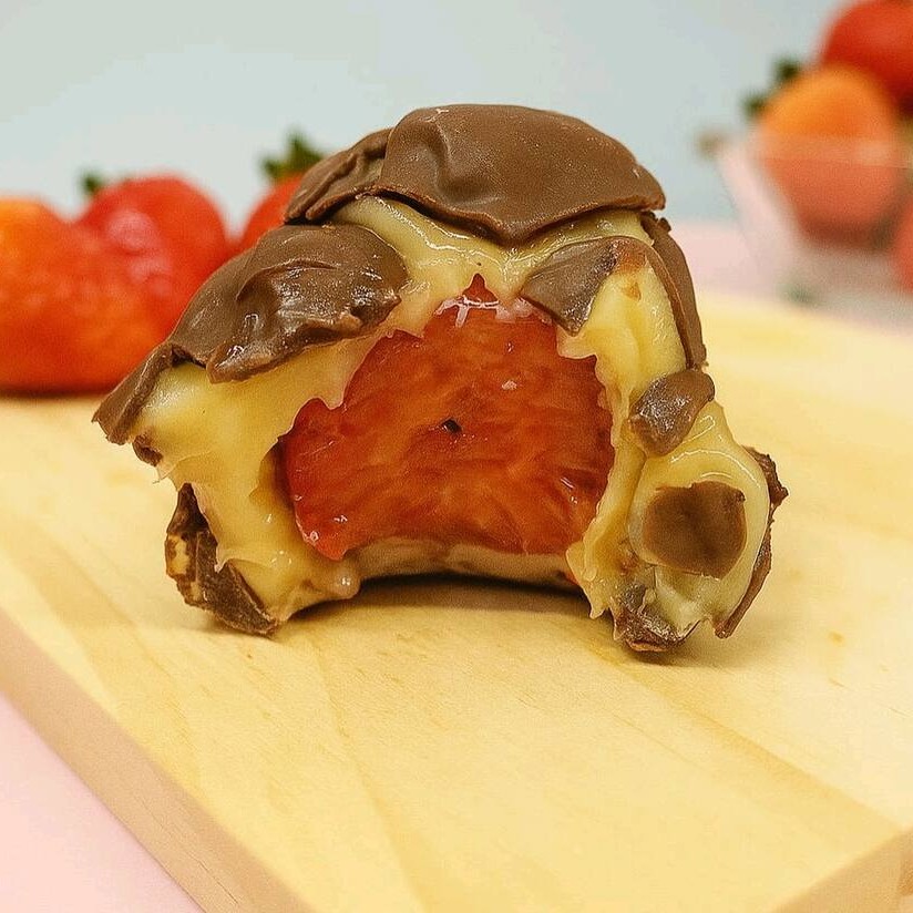 Morango fresco , envolto no brigadeiro de Ninho , finalizado numa casquinha de chocolate ao leite .
