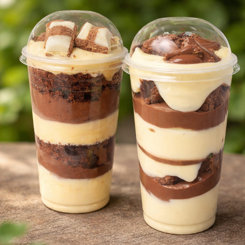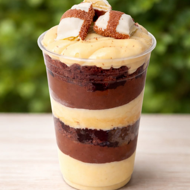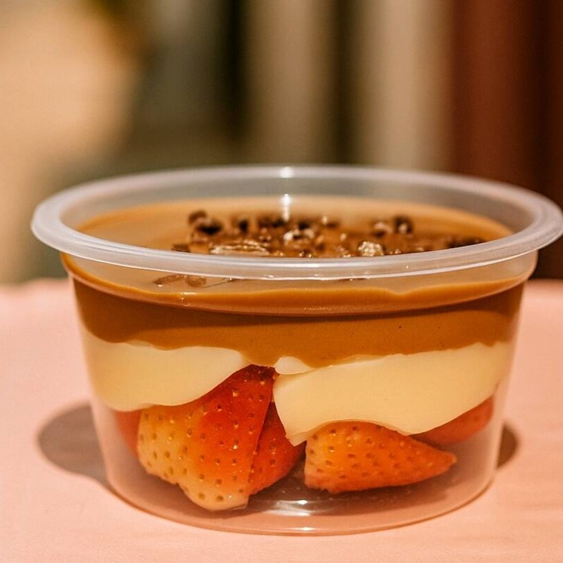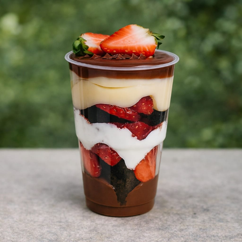 Copo Delícia de Morango: Camadas generosas de brownie macio, morangos frescos, creme de leite Ninho, mousse suave de Ninho , e creme de chocolate. Uma sobremesa cheia de sabor e textura!