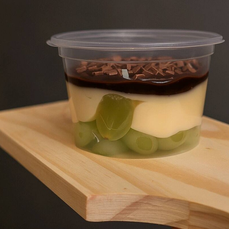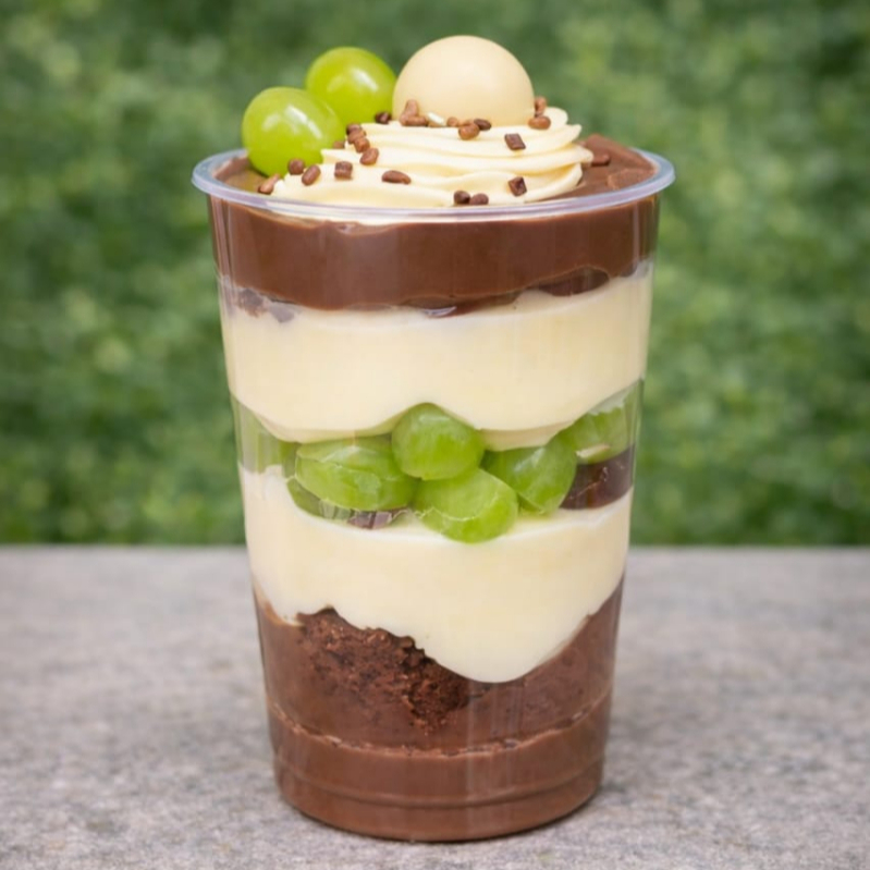 Delícia de Uva: Camadas perfeitas de brownie macio, uvas sem semente fresquinhas, creme de leite Ninho e creme de chocolate 50%. Uma sobremesa equilibrada e irresistível!