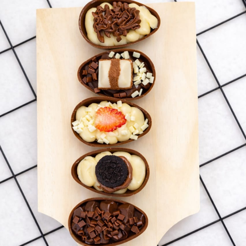 Nosso Kit de Mini Ovinhos Recheados é feito artesanalmente, com casquinha de chocolate e muito recheio cremoso. O kit contém 5 mini ovinhos de aproximadamente 45g a 50g cada, com os seguintes sabores: * Brigadeiro de panela * Ninhotella * Kinder * Ninho com morango * Ninho com Oreo