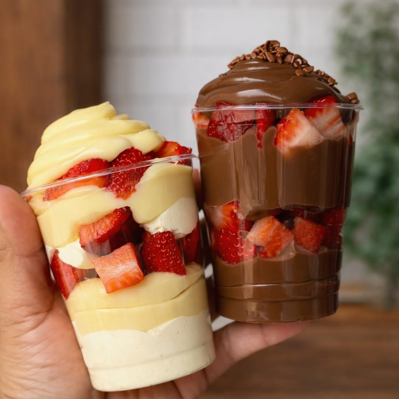 Dois copos de 200 ml com a combinação perfeita de morango fresco, creme suave e muito sabor. Ideal para dividir ou para quem ama sobremesa com fruta.