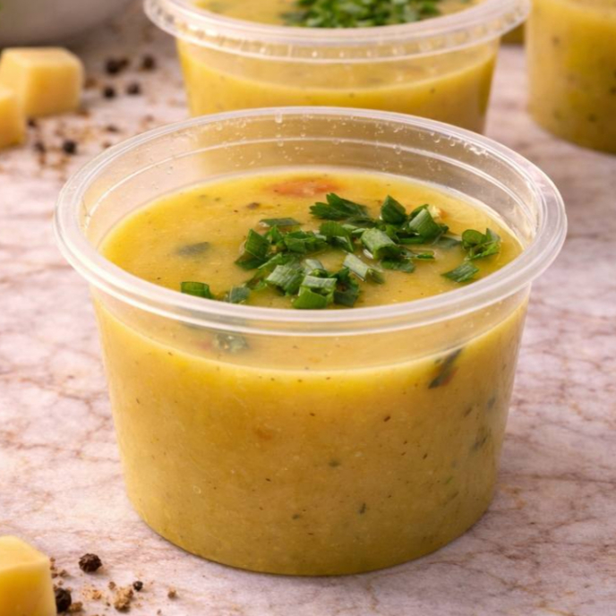 Cremoso e super aconchegante, nosso caldo de batata salsa é preparado com batatas bem cozidas, frango desfiado, alho e cebola refogados na medida certa, trazendo muito sabor e aquele temperinho caseiro irresistível. Finalizado com cebolinha fresquinha, é perfeito pra aquecer o coração e matar a fome