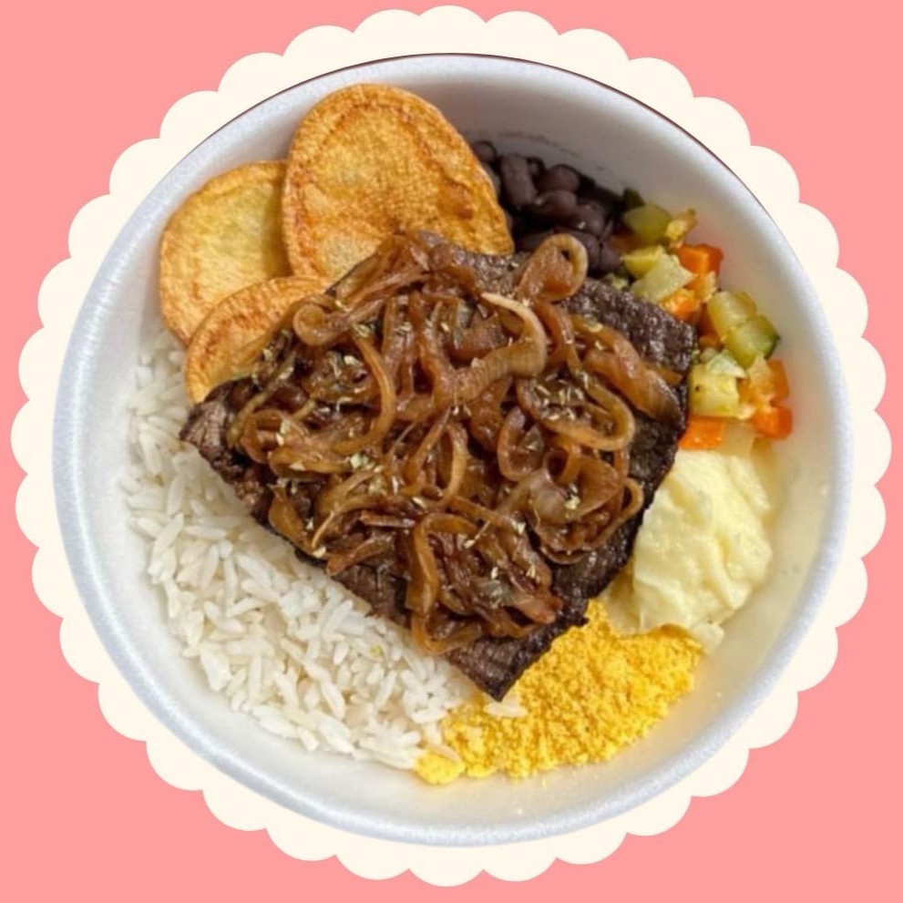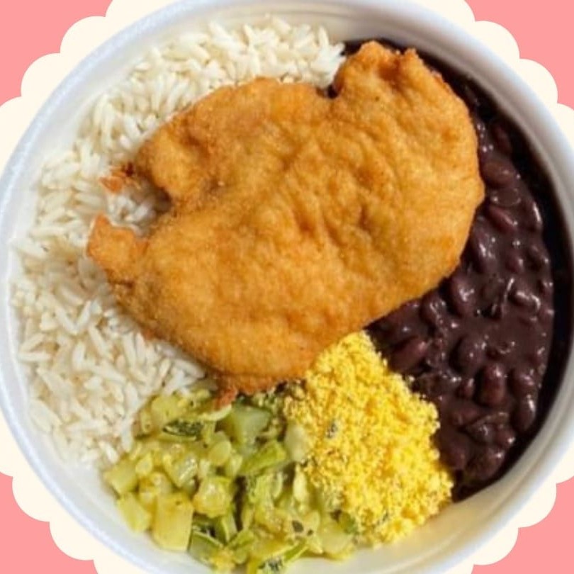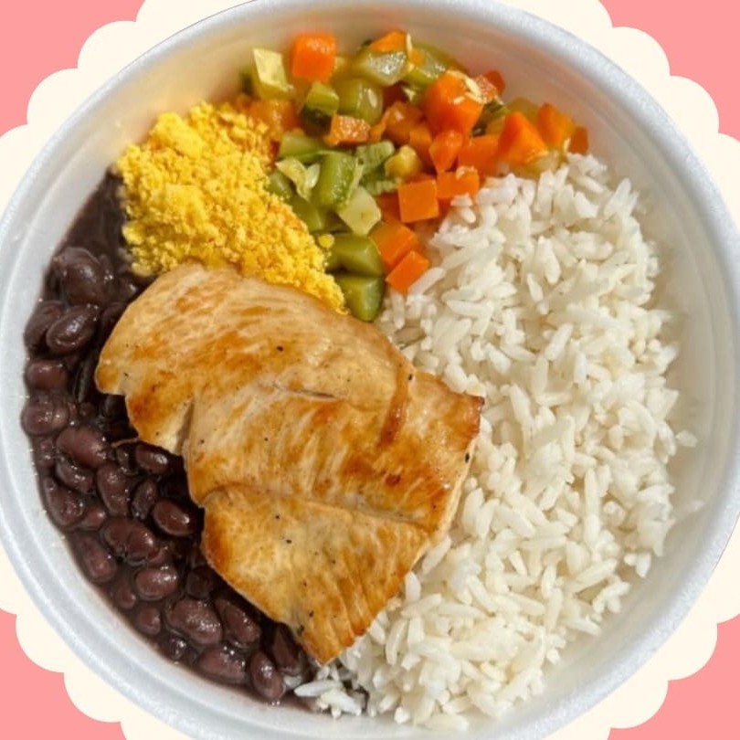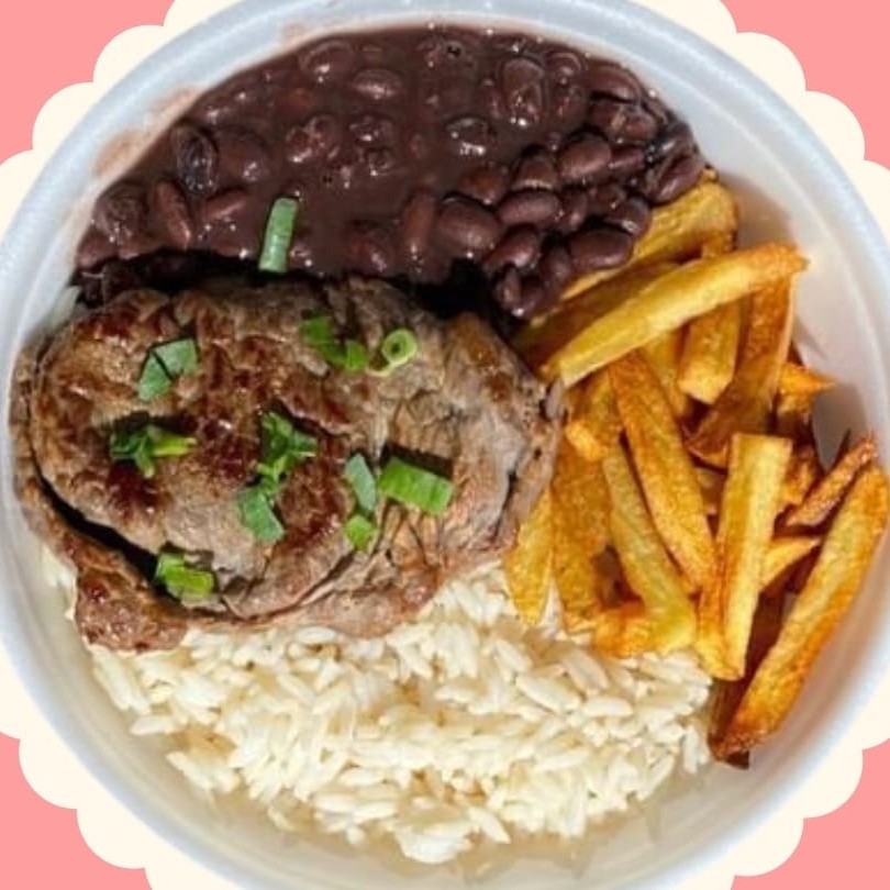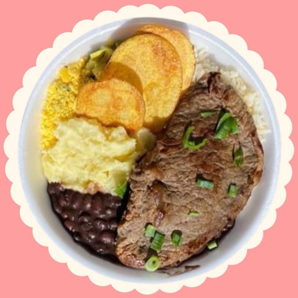 Uma refeição completa e saborosa! ️ Arroz soltinho, feijão fresquinho e purê cremoso, acompanhados da proteína da sua escolha (aprox. 400g no total). Finalize como preferir: farofa crocante, batata chips, salada fresca ou legumes refogados. Perfeito para matar a fome com muito sabor!