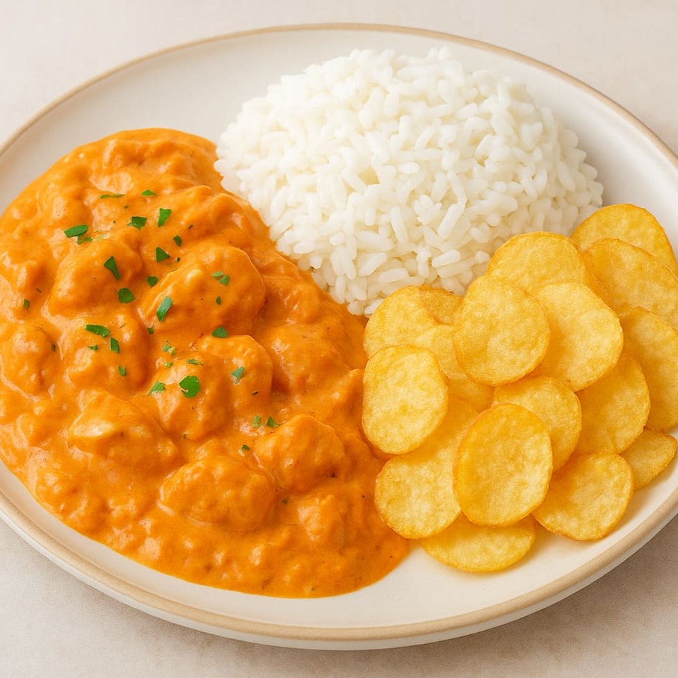 Creme aveludado de strogonoff feito com peito de frango macio, refogado com temperos frescos e finalizado com molho de tomate e toque de creme de leite. Acompanha arroz soltinho e crocantes batatas chips para completar a experiência. Uma refeição caseira, farta e cheia de sabor, perfeita para quem ama o verdadeiro strogonoff brasileiro. Aproximadamente 400g