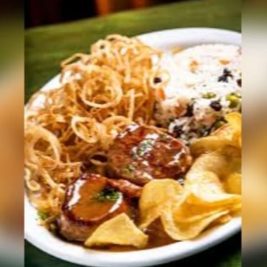 Acompanha salada de tomate, alface, batata frita e arroz.