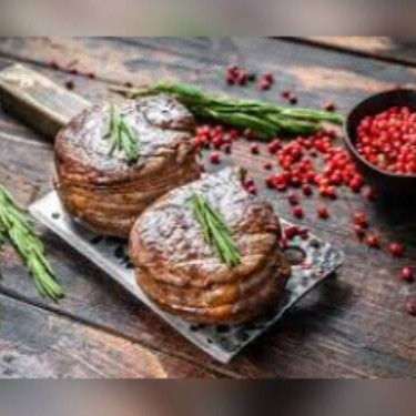 Filé Mignon grelhado, acompanha deliciosa salada de tomate, alface, batata frita à Baviera e arroz.