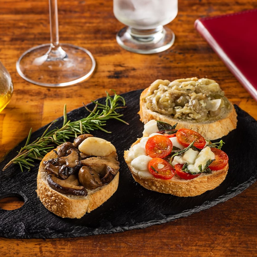 Trilogia de Brusquetas com três sabores cada uma: Beringela à Baviera com Gorgonzola, Cogumelos Confitados e Caprese