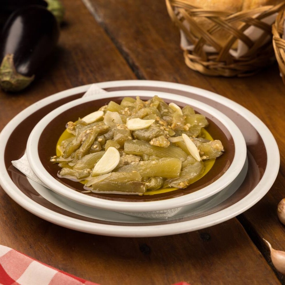 Porção de Beringela à Vinagrete acompanhada de Torradas.