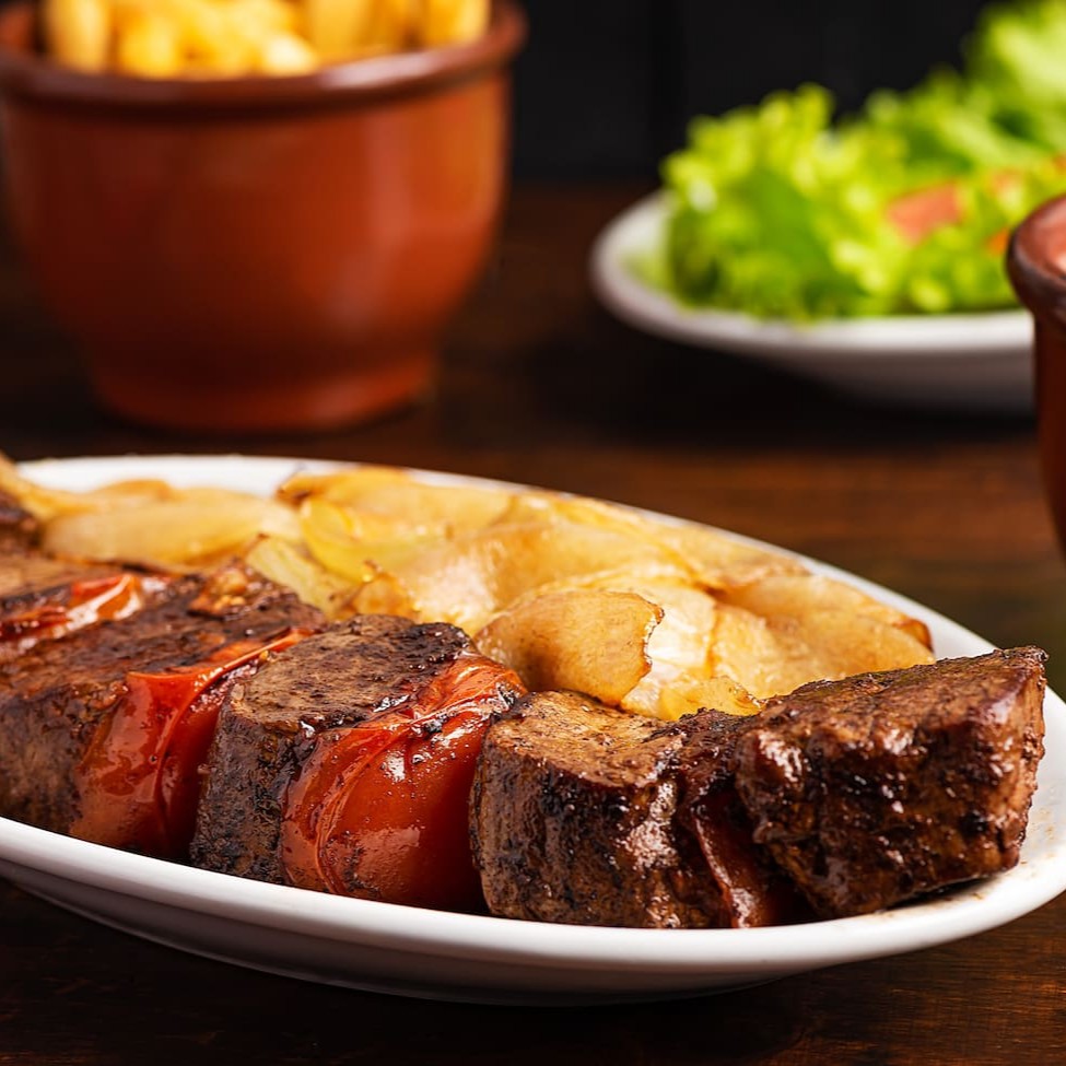 Espeto de Mignon, com tomate e Pétalas de Cebola. Acompanha salada de Tomate e Alface, Batata Frita e Arroz.