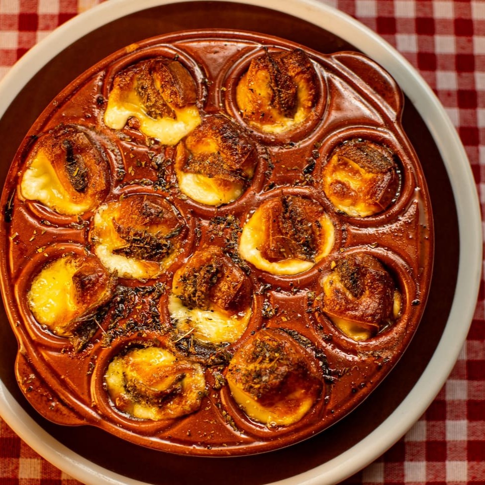 Porção de Provolone assado no forno à lenha, com Alicci Importado.