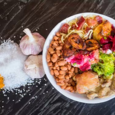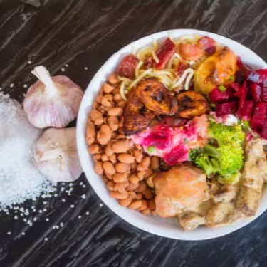 Arroz integral,feijão branco ou preto,legumes,batata doce e uma opção de carne.