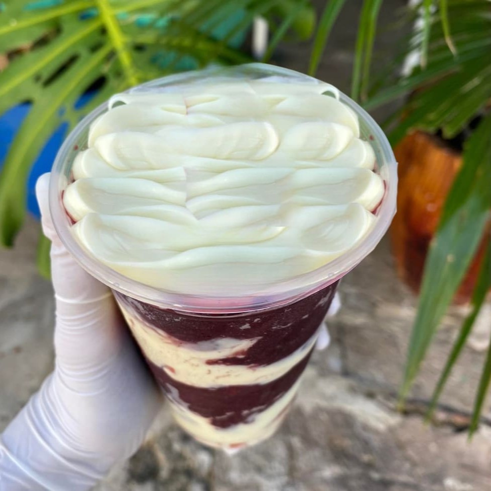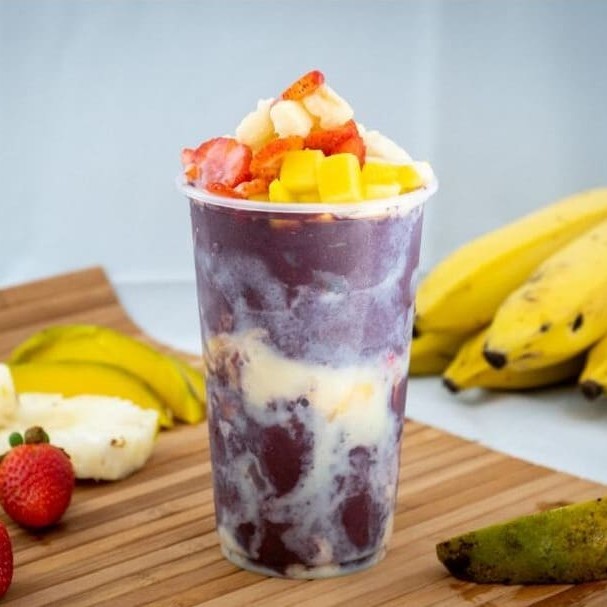 Açaí Premium 100% Cremoso Acompanhado de Leite Condensado, Leite Ninho e Banana Fresca.