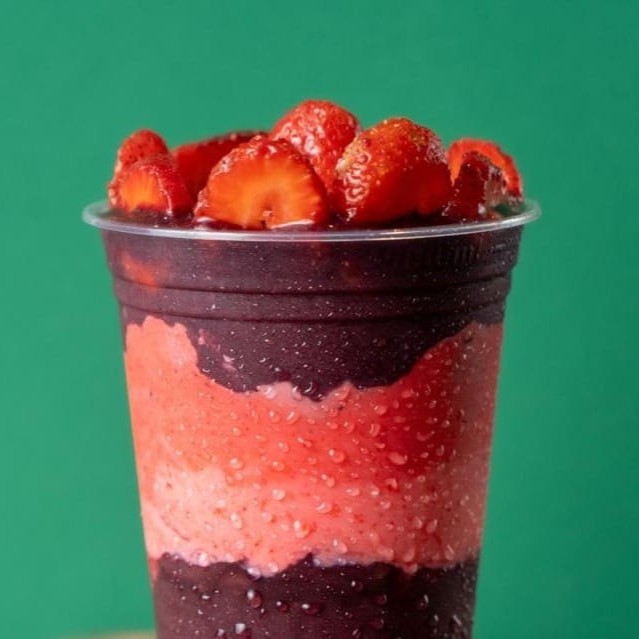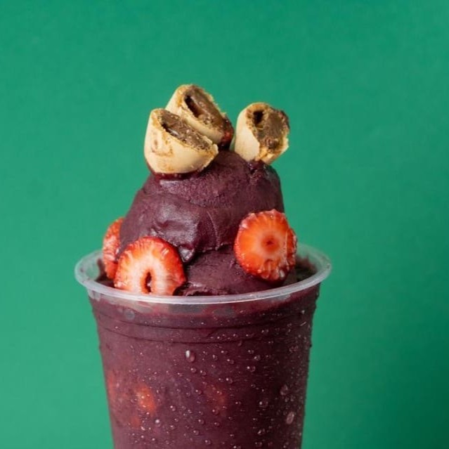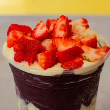 Açaí Super Cremoso Acompanhado de Paçoca, Leite Condensado, Leite Ninho e Morangos Frescos.