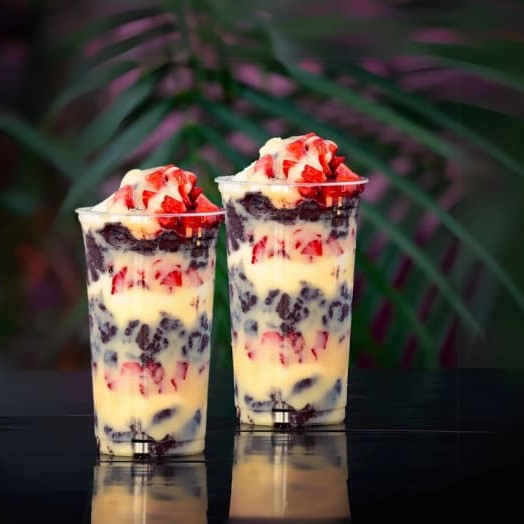 São 2 Copos Feitos com Açaí Super Cremoso Acompanhado de Leite Condensado, Leite Ninho e Morangos Frescos.