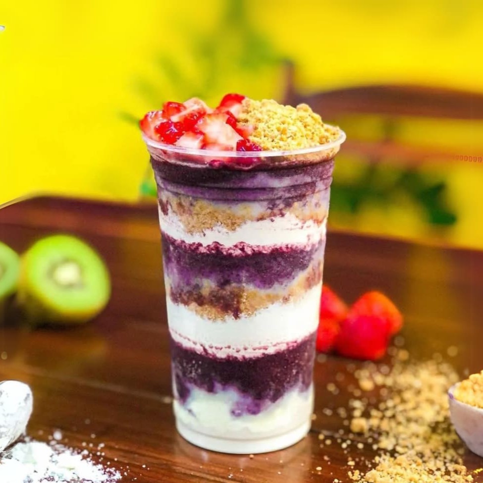 Açaí Premium 100% Cremoso Acompanhado de Leite Condensado, Leite Ninho e Ovomaltine Crocante.