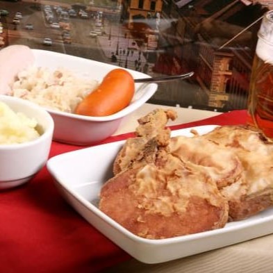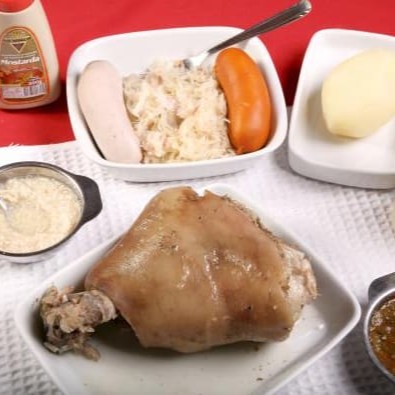 Acompanha purê de batatas, chucrute, salsicha branca e salsicha vermelha
