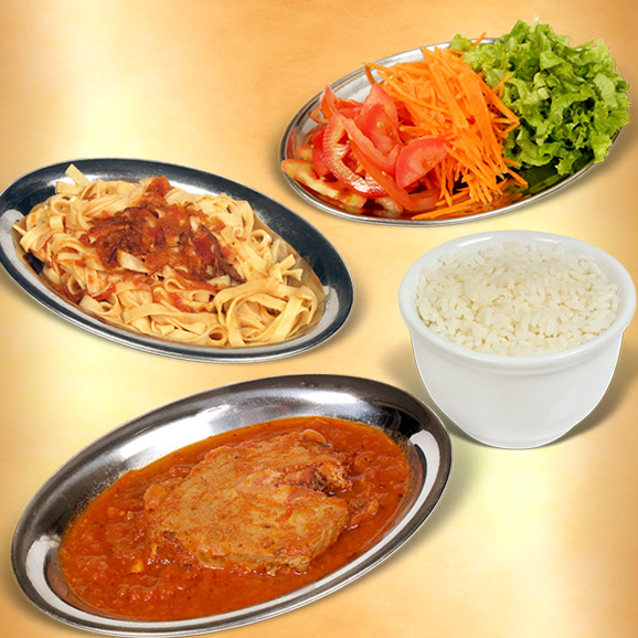 Posta ao molho, macarrão caseiro, arroz e salada