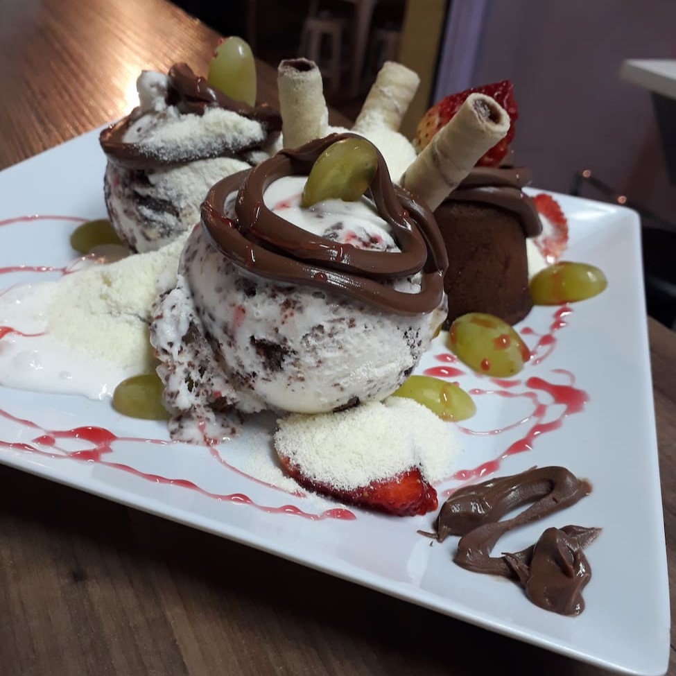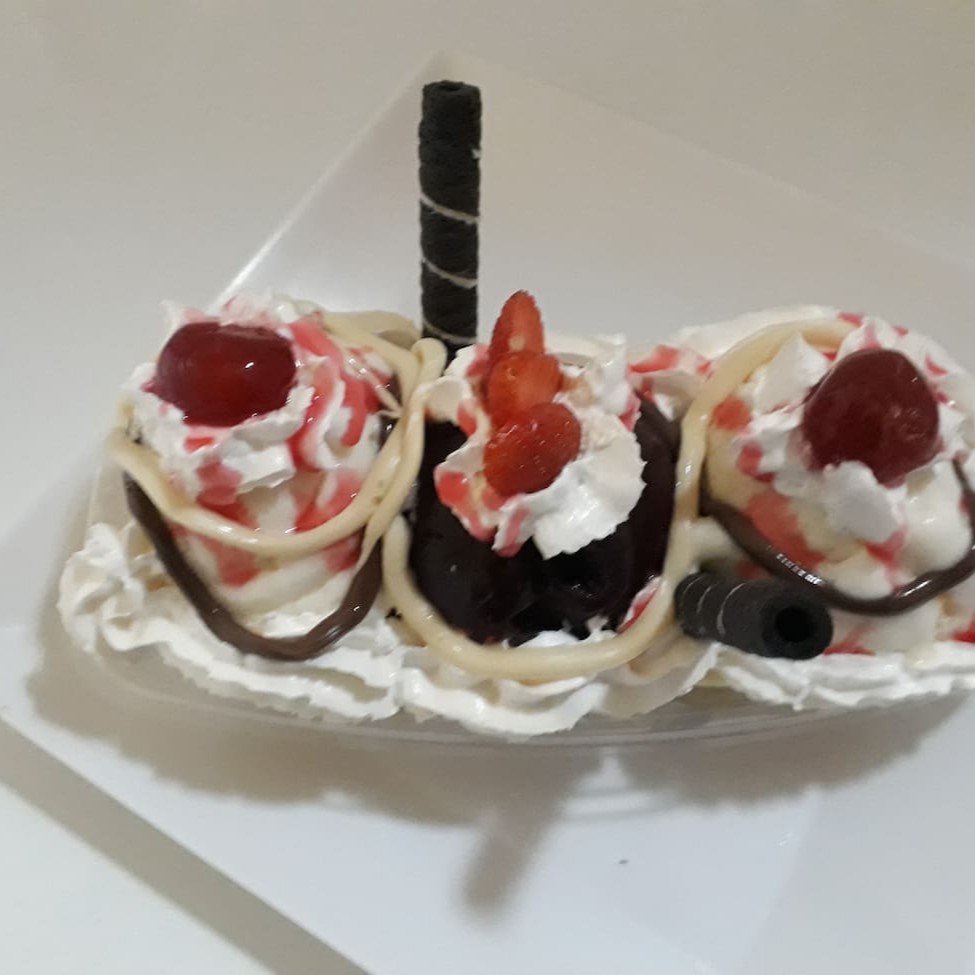 Banana, canela, calda caramelo, sorvete, cereja, cobertura, nutela e tubette
