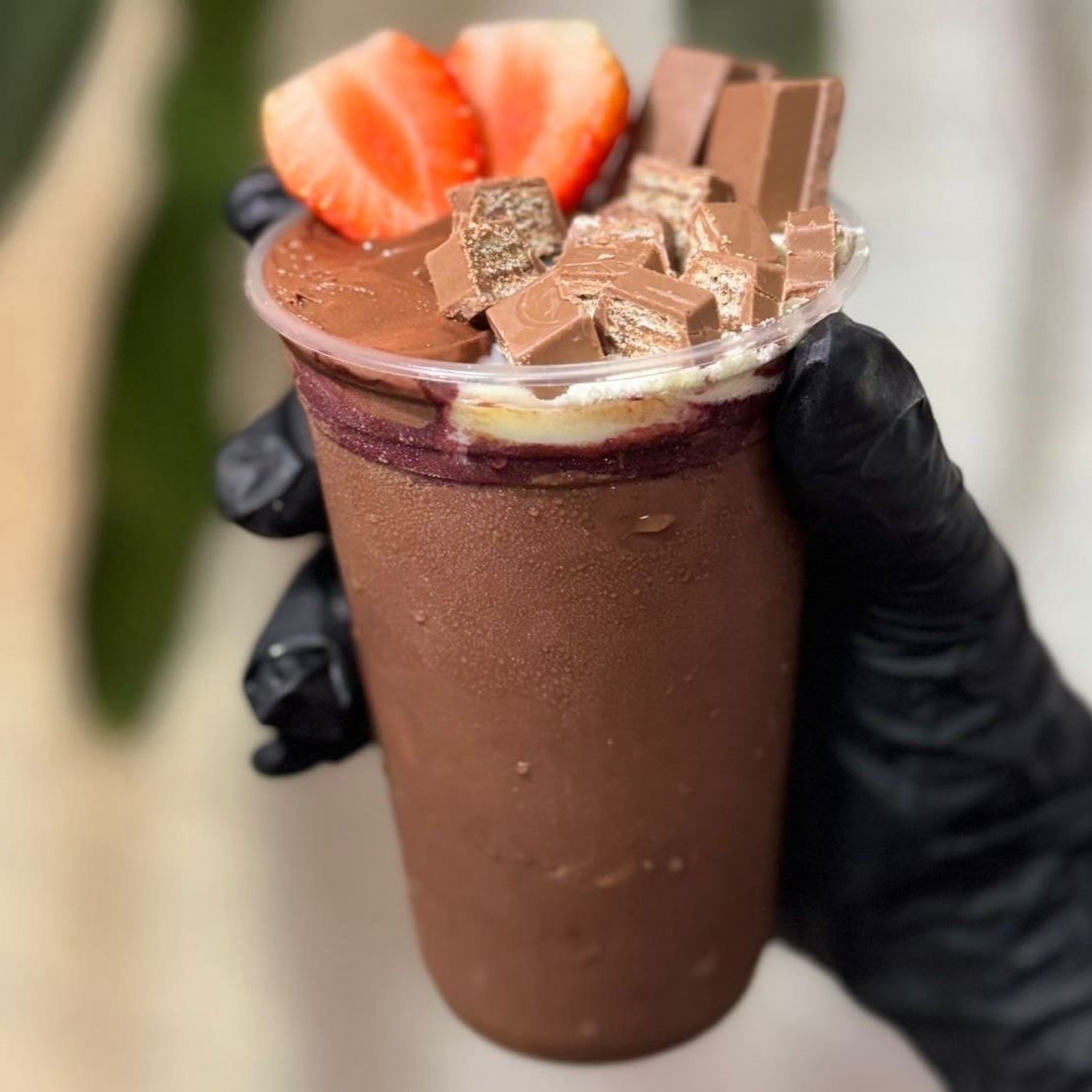Açaí · creme de avelã · KitKat · leite condensado · leite em pó · e fruta a sua escolha. Açaí cremoso com creme de avelã misturado na base e pedaços de KitKat espalhados pelo copo — aquele sabor característico que ninguém consegue ignorar. Cada colherada tem um equilíbrio diferente entre o cremoso do açaí e o crocante do chocolate. Para os momentos em que você merece algo especial.