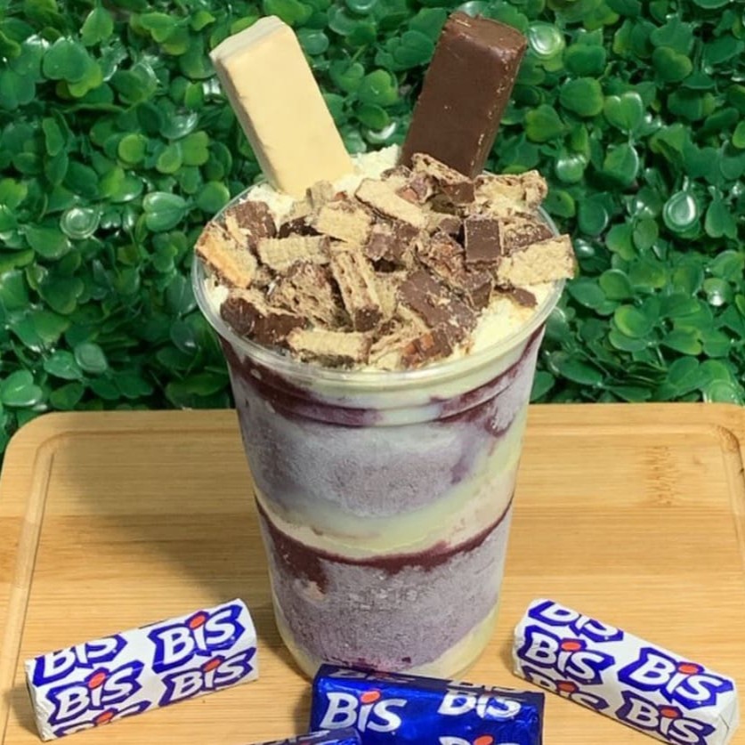 Açaí · creme de avelã · Bis triturado · Chocoball · leite condensado · e fruta a sua escolha. Chocolate em dobro — isso sim é sério. Creme de avelã, Chocoball crocante, e Bis triturado por cima fechando com chave de ouro. Cada camada entrega um prazer diferente: cremoso, crocante e, intenso. O copo que faz os apaixonados por chocolate dizerem "é exatamente isso que eu queria".