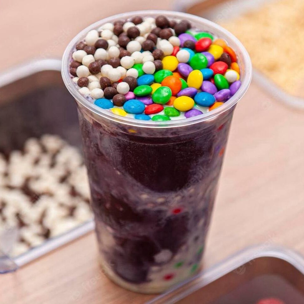 Açaí batido com paçoca, adicionado creme de paçoca, e leite condensado.
