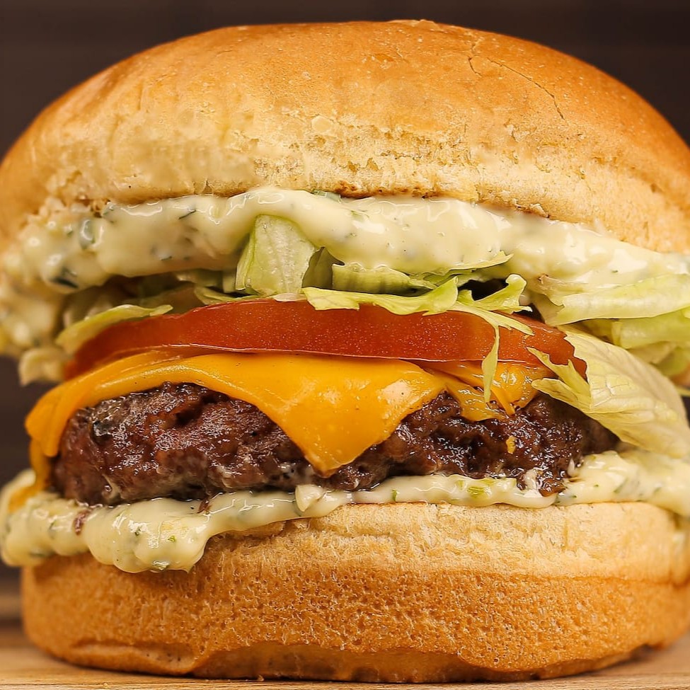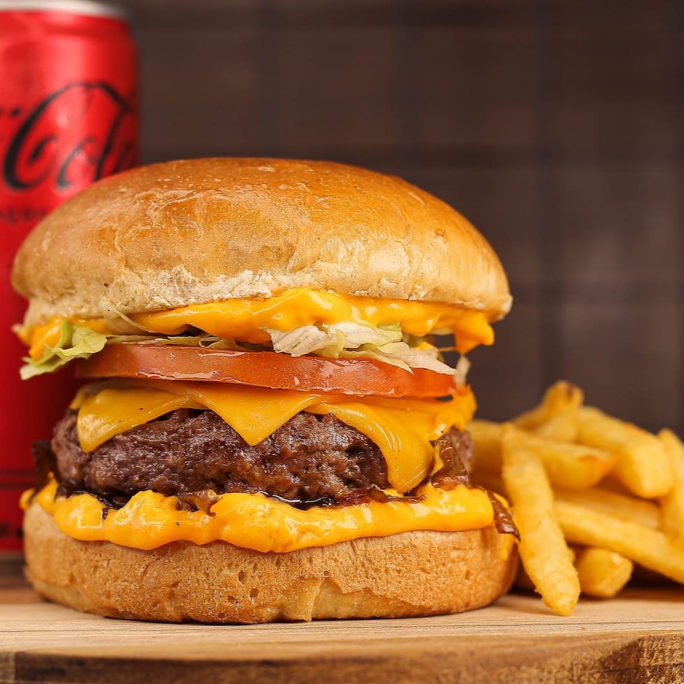 Pão brioche, carne artesanal bovina 100g (in natura) grelhada no fogo, fatia de queijo cheddar, alface americana, tomate e maionese temperada com ervas e alho.