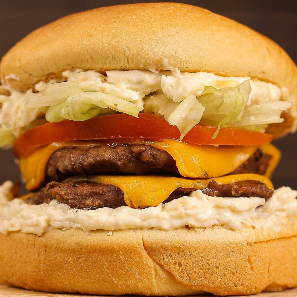Pão brioche, 2x proteínas vegetarianas de 60g grelhadas no fogo, 2x fatias de queijo cheddar, alface americana, tomate e molho parmesão da casa.