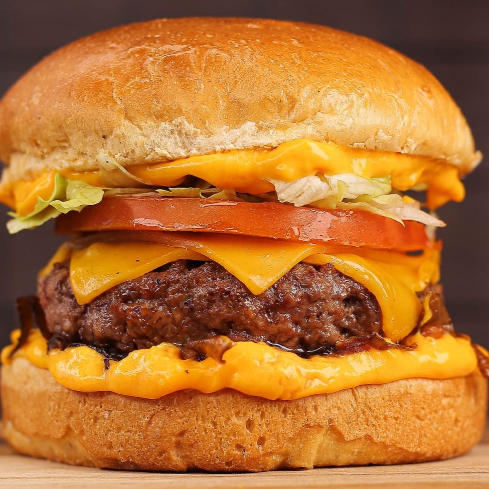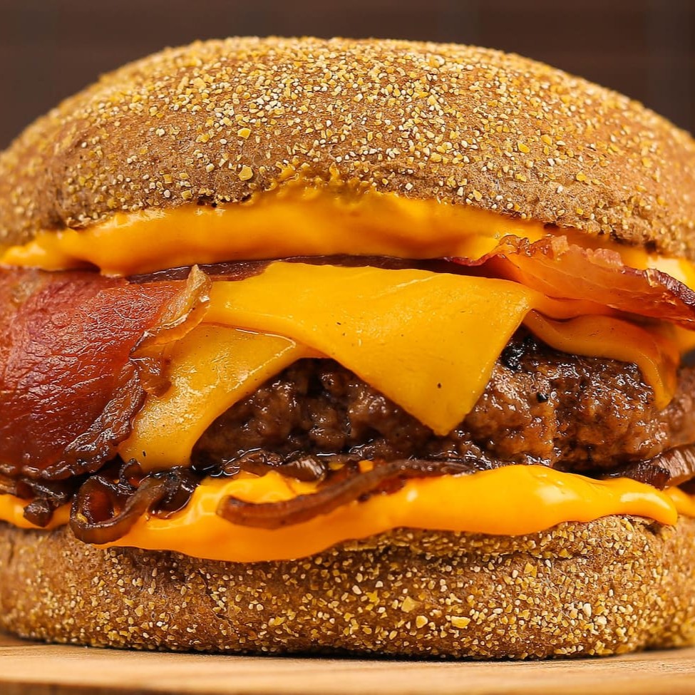 Pão australiano, carne artesanal bovina 160g (in natura) grelhada no fogo, fatia de queijo cheddar, cebola caramelizada, bacon crocante e molho cheddar artesanal.