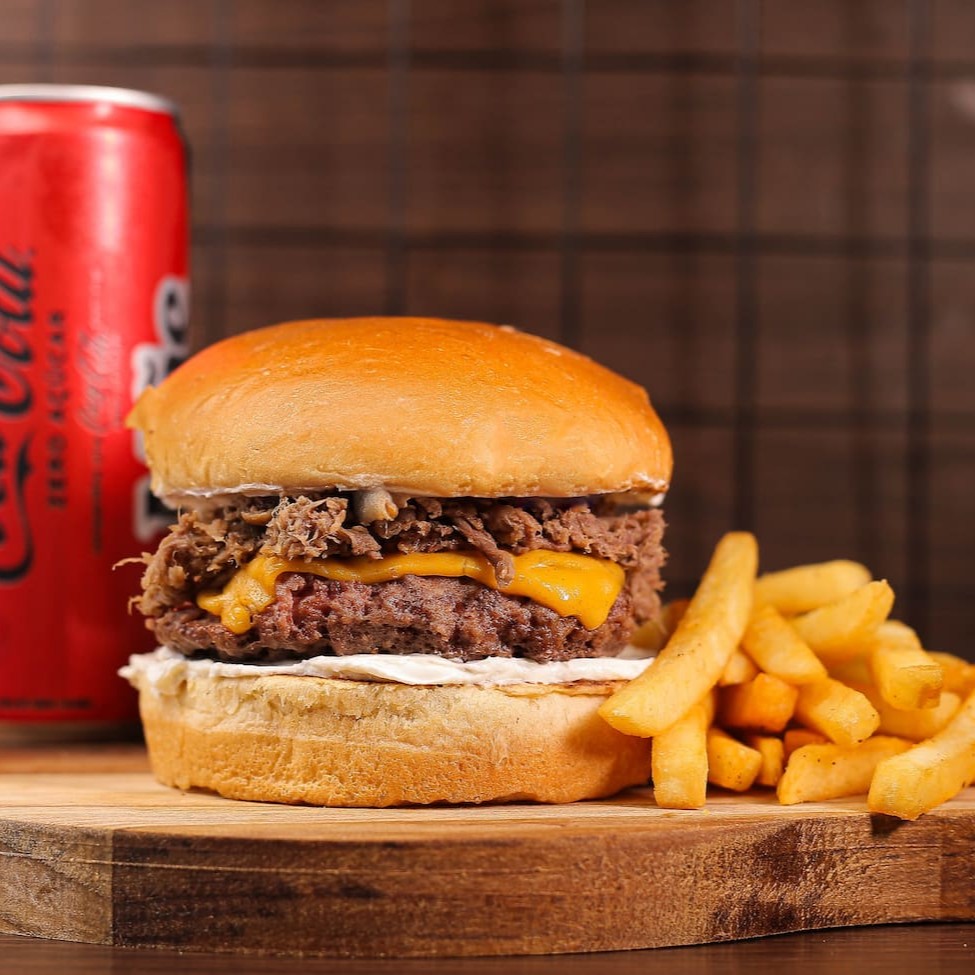Pão brioche, cream cheese, blend bovino 120g (in natura), fatia de queijo cheddar e costela desfiada por cima do blend.