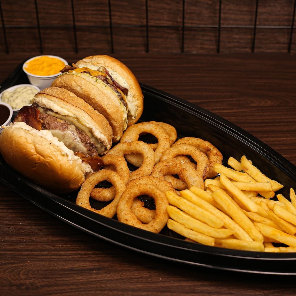 Barca com dois burgers a sua escolha e duas opções de porções, ótima para surpreender pessoas queridas, bonita e saborosa.