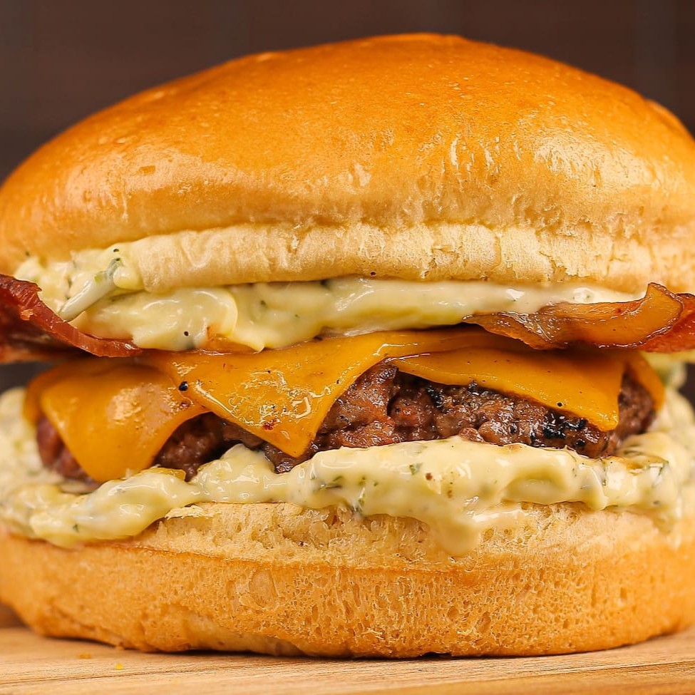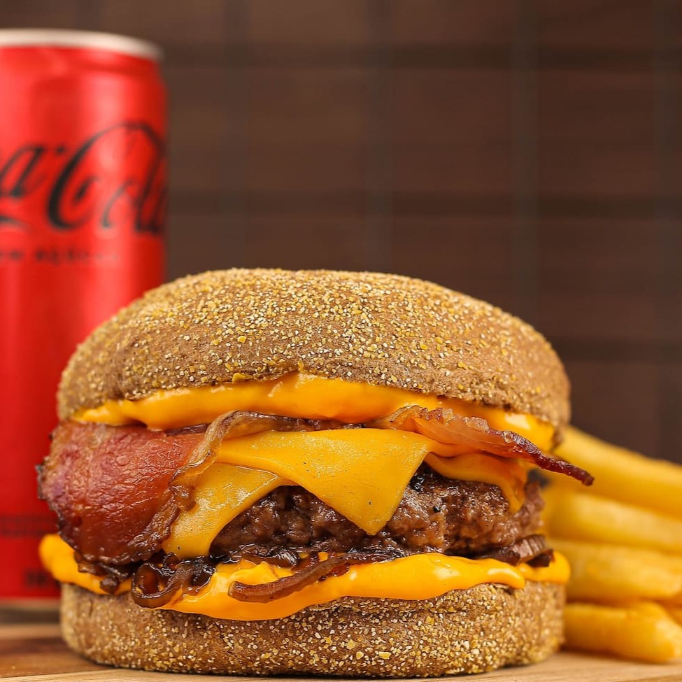 Pão brioche, carne artesanal bovina 100g (in natura) grelhada no fogo, fatia de queijo cheddar, bacon crocante e maionese temperada com ervas e alho.