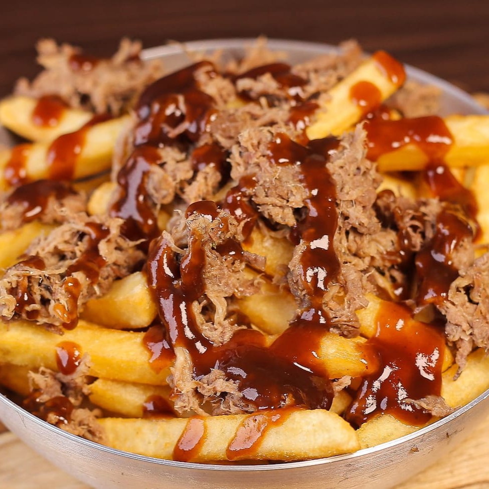 Porção de batata frita recheada com costela desfiada e molho barbecue.