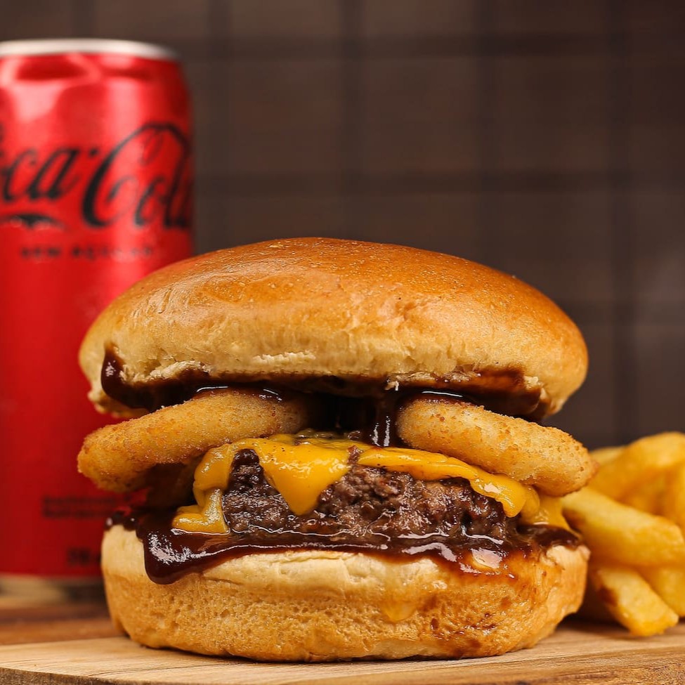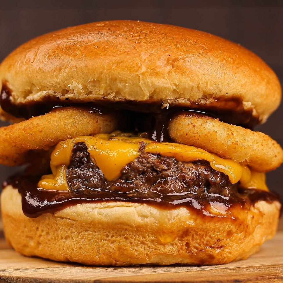 Pão brioche, carne artesanal bovina 160g (in natura) grelhada no fogo, fatia de queijo cheddar, dois anéis de cebola e molho barbecue.