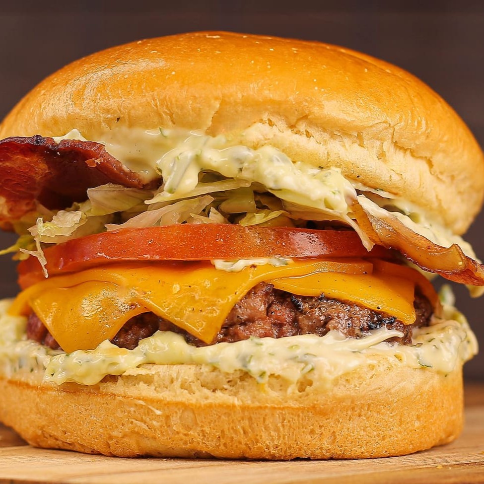 Pão brioche, carne artesanal bovina 100g (in natura) grelhada no fogo, fatia de queijo cheddar, alface americana, tomate, bacon crocante e maionese temperada com ervas e alho..