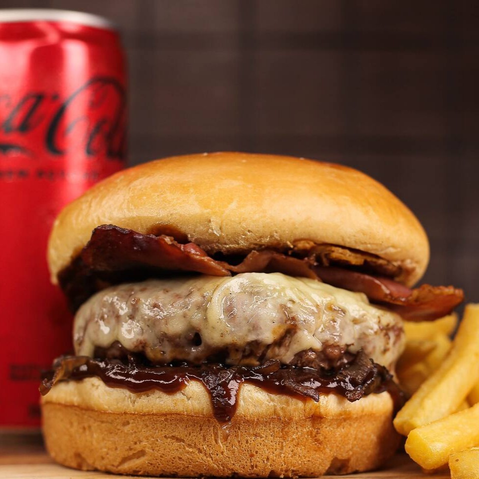 Pão brioche, carne artesanal bovina 160g (in natura) grelhada no fogo, fatia de queijo mozarella, cebola caramelizada, bacon crocante e molho barbecue.