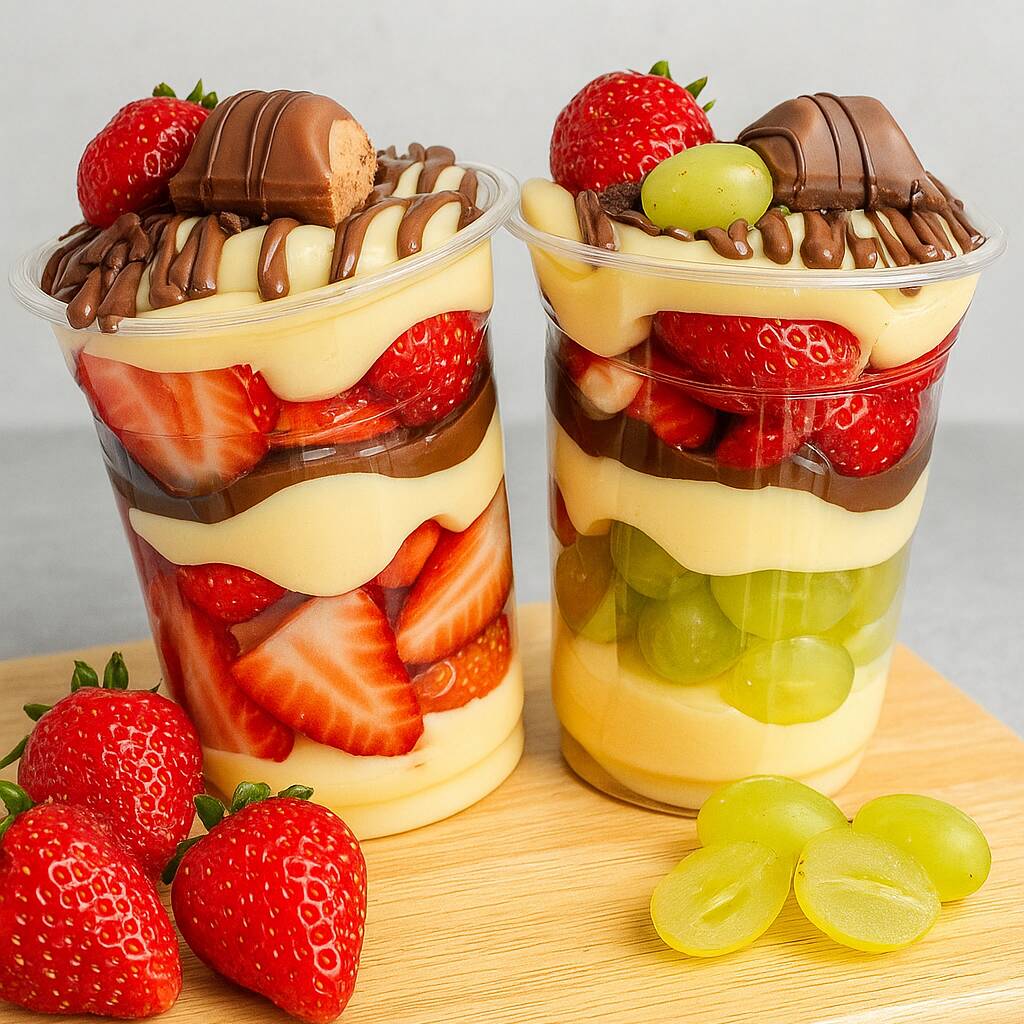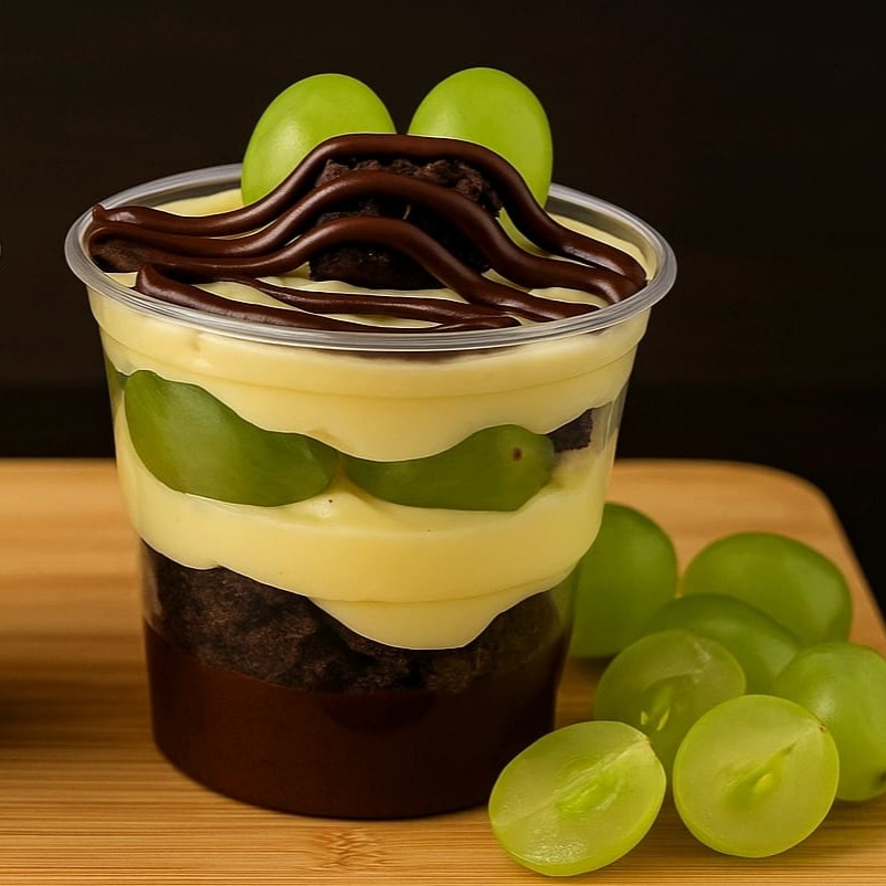 Surpresa de Uva – Leite Ninho & Brigadeiro Meio Amargo Uma combinação irresistível que une camadas cremosas de leite Ninho com o equilíbrio perfeito do brigadeiro meio amargo, realçado pela leveza e frescor das uvas verdes. Cada colherada é uma explosão de sabores e texturas que encantam o paladar, unindo a doçura delicada ao toque refinado do chocolate. Uma sobremesa sofisticada, preparada com capricho para transformar qualquer momento em uma experiência inesquecível.