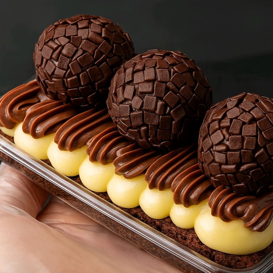 Massa úmida de cacau com Brigadeiros meio amargo cremoso, ganache cremoso e finalizado com ganache meio amargo para equilibrar. Porção individual e com uma embalagem na versão elegante Premium sim desejar presentear feia para encantar desde o primeiro olhar