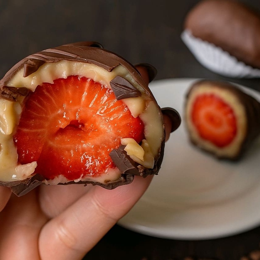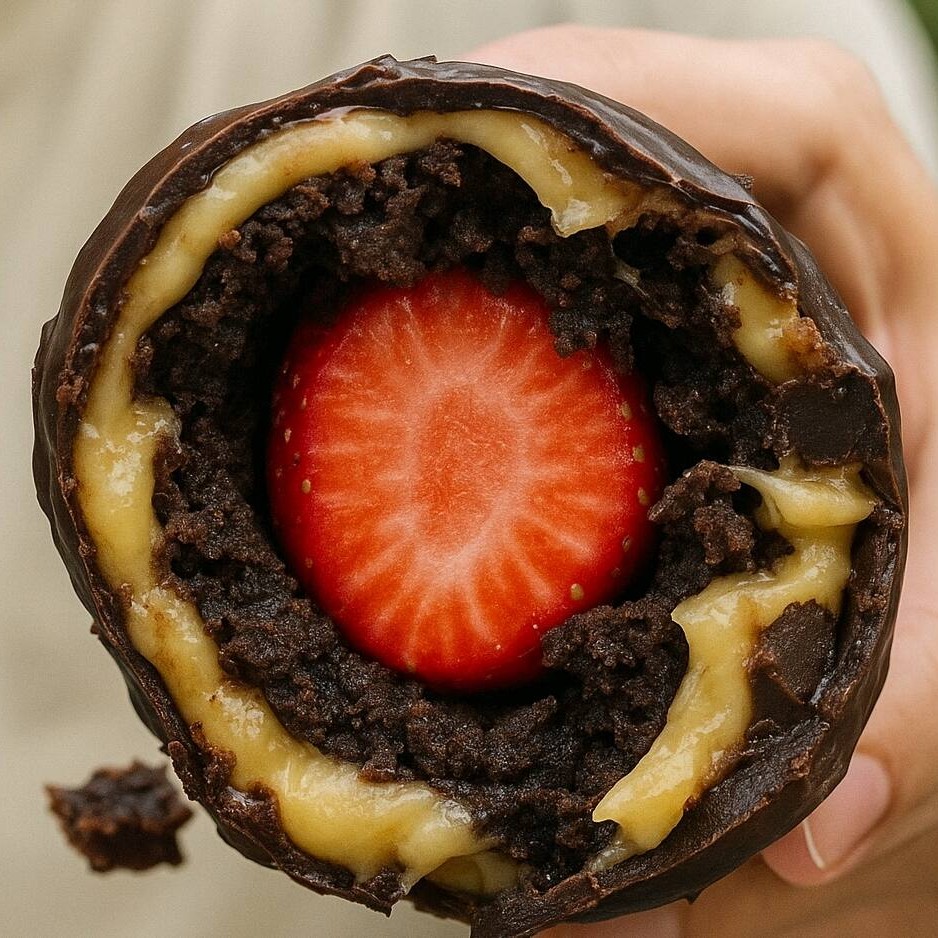 Bombom de Morango Gourmet Uma explosão de sabores em cada mordida! Morango fresco envolto em um delicioso brigadeiro de leite Ninho, seguido por uma camada de brownie super macio e finalizado com uma casquinha crocante de chocolate meio amargo. Perfeito para quem ama uma sobremesa intensa, equilibrada e feita com carinho nos mínimos detalhes.
