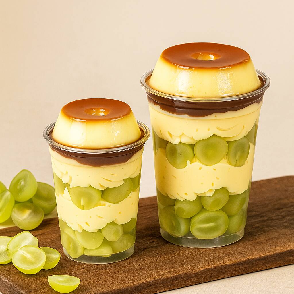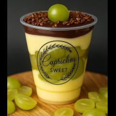 Copo da Felicidade Surpresa de uva Uma combinação irresistível para adoçar seu Dia: camadas cremosas de brigadeiro, uvas verdes fresquinhas e suculentas brigadeiro ou creme meio amargo , finalizadas com um delicioso pudim caramelizado no topo. Uma explosão de sabor e frescor em cada colherada, perfeita para quem ama surpreender o paladar! temos disponível 2 tamanhos