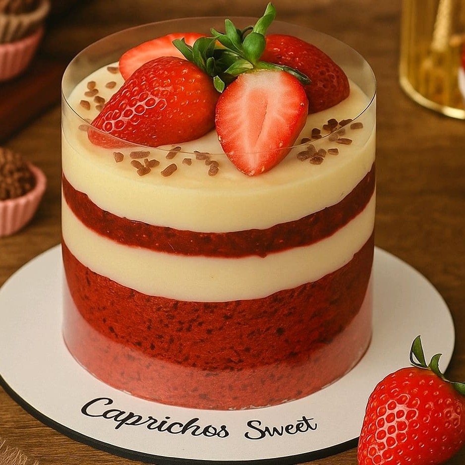Mini Naked Cake Red Velvet – Caprichos Sweet ️ Um presente inesquecível ou a escolha perfeita para comemorar! Nosso naked cake de 500g combina a clássica massa Red Velvet com um recheio branco suave e geleia artesanal de frutas vermelhas. Finalizado com morangos frescos e camada cremosa no topo, tudo com acabamento elegante em acetato. Feito com ingredientes selecionados, pronto para surpreender em qualquer ocasião caixa de presente e inclui uma velinha